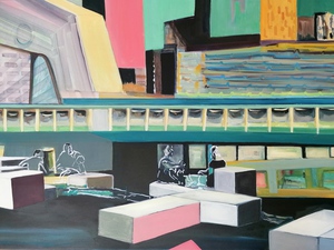 2020Afstand in coronatijd, de stad wordt stil. Olierverf op doek. Aan de hand van samengestelde beelden, d.w.z. foto's die ik tijdens een wandeling door de wijk Katendrecht in Rotterdam maakte, heb ik van verschillende foto's eerst een collage op papier gemaakt, dit werd het uitgangspunt voor het schilderij. Olieverf op doek